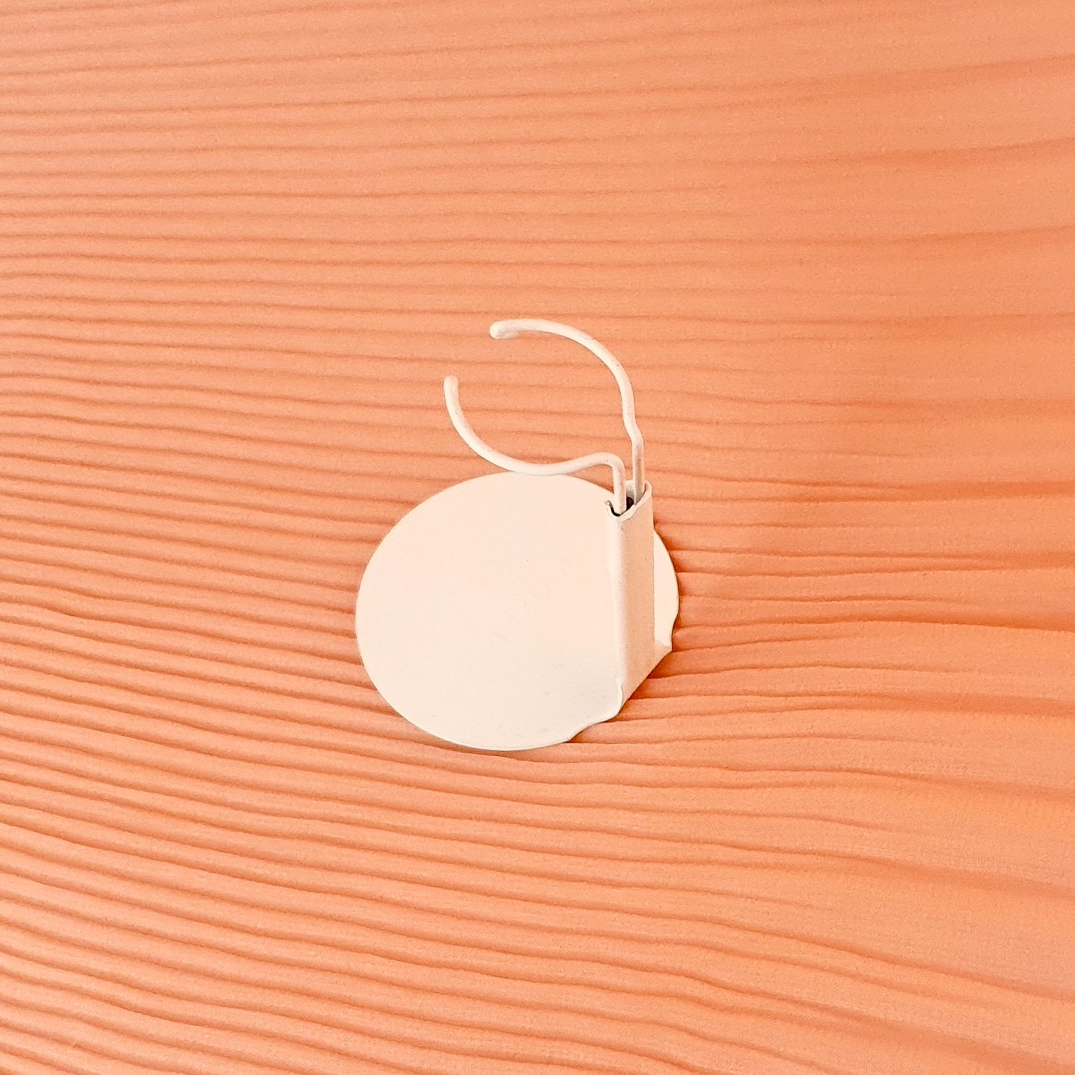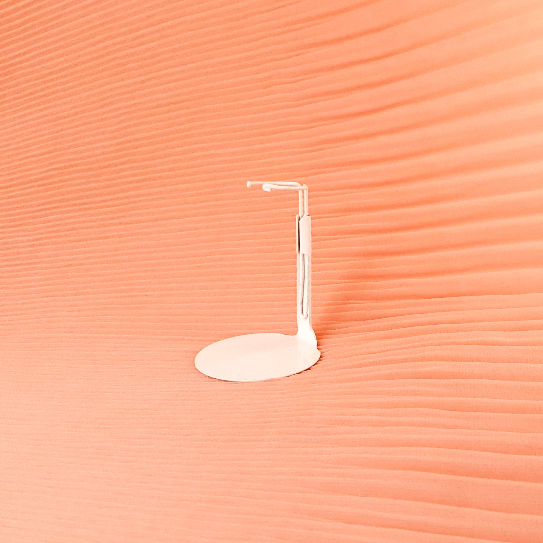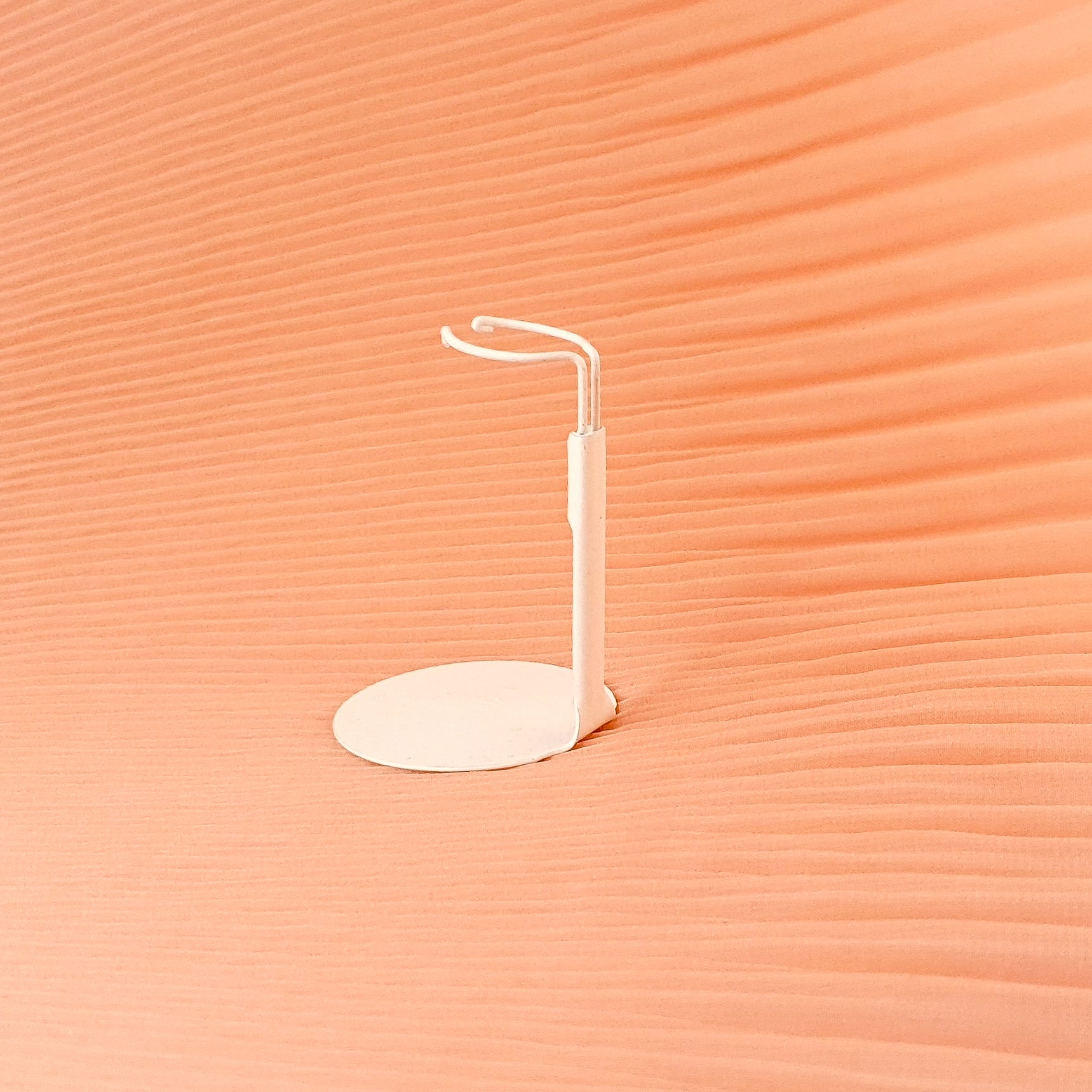 Valkoinen, metallinen nukketeline joka on sopiva nukkekotinukeille.