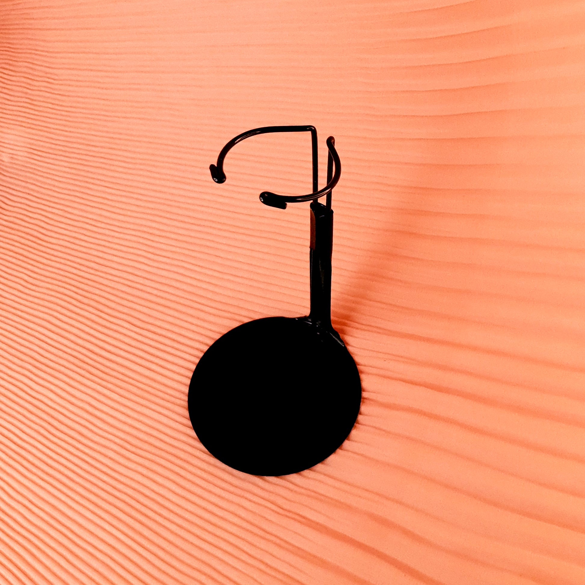 Musta, metallinen nukketeline joka on sopiva Ken-tyyppisille nukeille ja muille Barbie-tyyppiä leveäuumaisemmille nukeille. Tämä malli sopiva myös PetrelliArtin Calliopeia Dolls -nukeille.